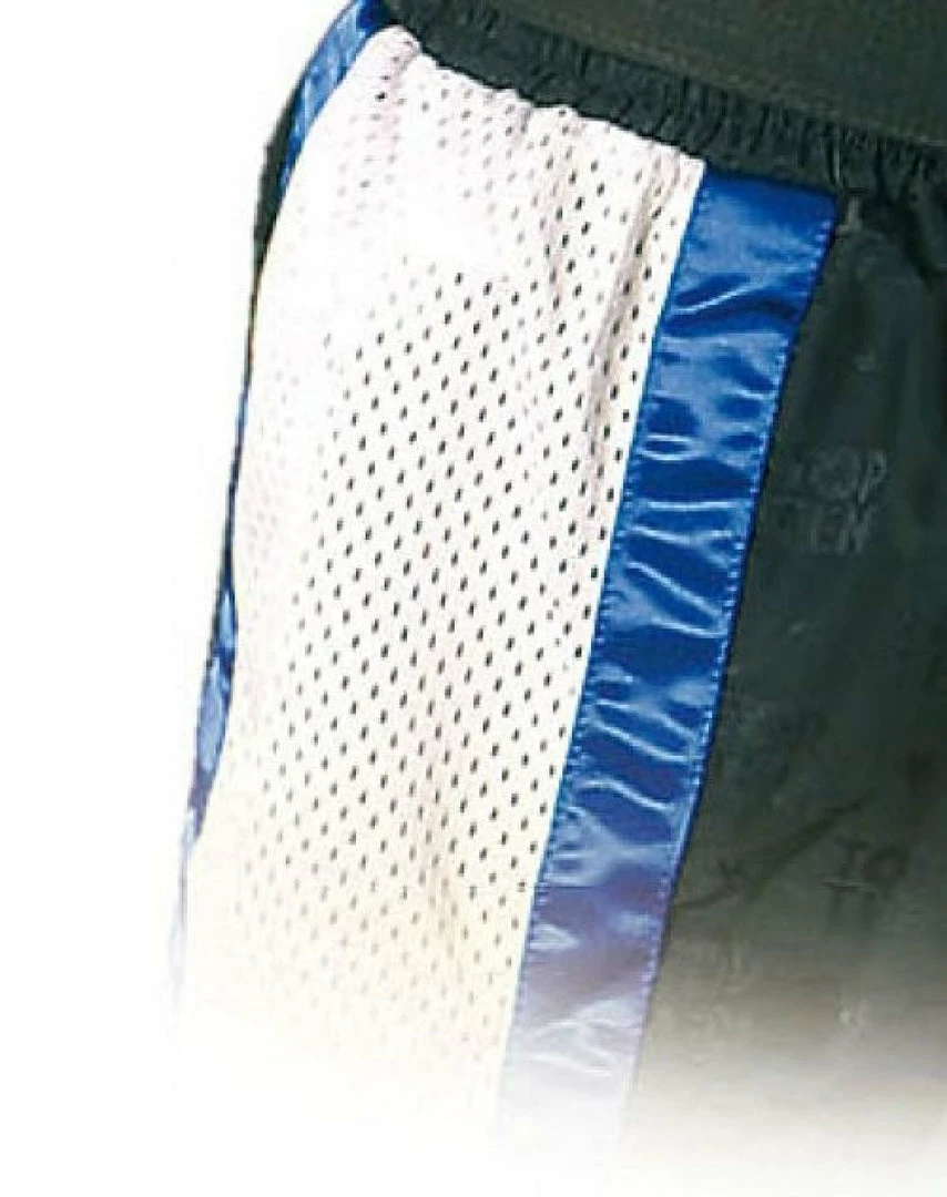 Our most popular Black model with White mesh and Blue trim, is made of an ultra-light, polyamide material like satin. Polyamide will not stick to the body like old school satin material, polyamide repels moisture and is a quick dry material.