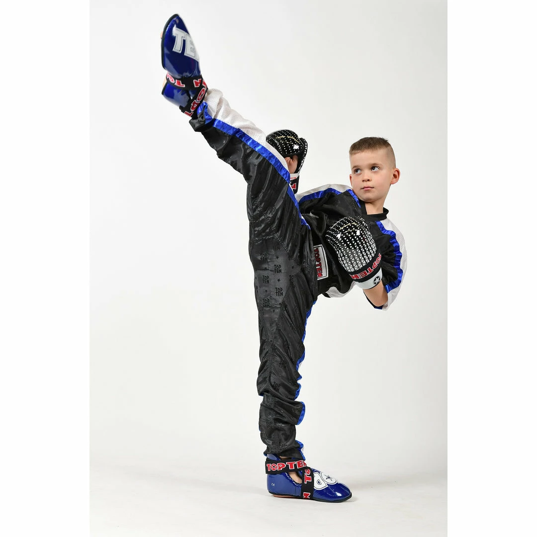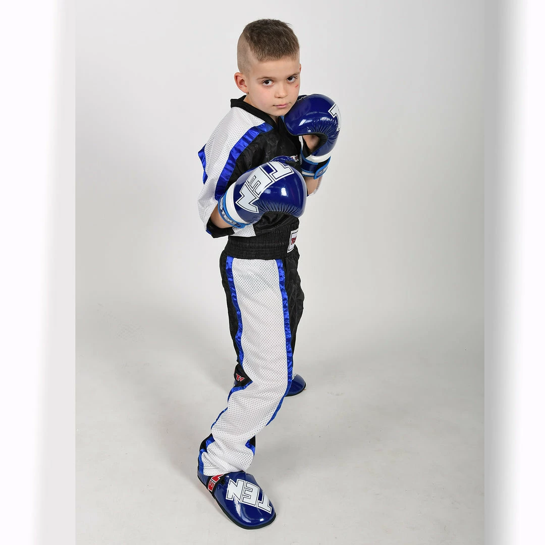 A wide flexible mesh strip extends across the entire uniform top and around the enhanced elasticity V neck. Then extends from under the arms through flank side area to the hips, providing way cooler side ventilation with maximum flexibility compared to old school solid style! Adding to the increased upper body ventilation in the top, the pants provide greater air flow and cooling through a wide mesh side strip extending from the wide elastic draw string tie waistband to the cuff. A gusseted groin allows room to wear groin protectors and have freedom of movement when performing leg and knee techniques. Additional shiny satin strips along the top and pants mesh reinforce the ultra light material for added strength, durability, and flash as you execute….